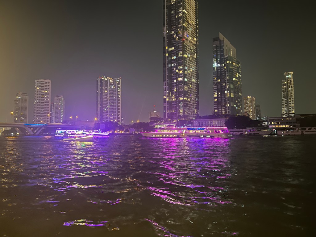 AFTER DARK THE RIVER COMES ALIVE WITH ELABORATE TOURISTS BOATS WITH LIGHTS AND MUSIC.
