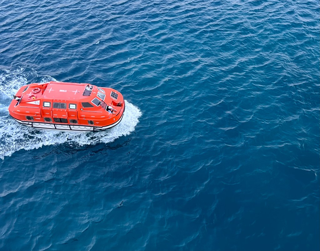 WE WENT ASHORE VIA THE SHIPS TENDERS. THESE WERE THE RESCUE CRAFT CAPABLE OF HOLDING 80…IN A PINCH.