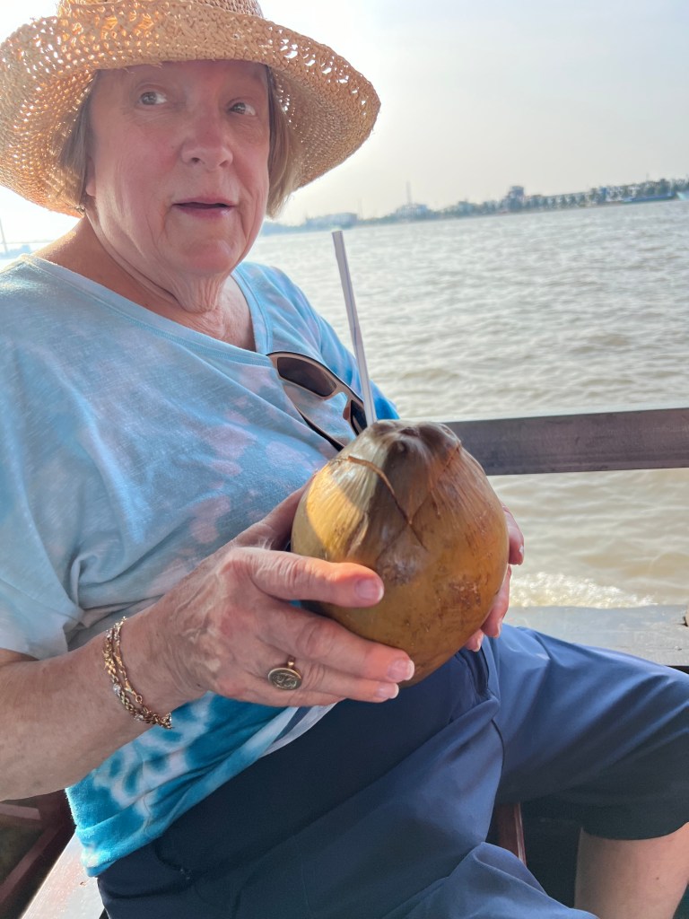 THE TOUR TODAY WAS ‘LIFE ON THE MEKONG RIVER’. THIS RIVER STARTS IN NEPAL AND FLOWS THROUGH THE INDOCHINA COUNTRIES TO DISCHARGE INTO THE SOUTH CHINA SEA. IT REMAINS THE MAJOR TRAFFIC THOROUGHFARE FOR BARGE AND COMMERCE. IT’S TIDAL AND PROVIDES FRESH WATER FOR THE RICE FIELDS.