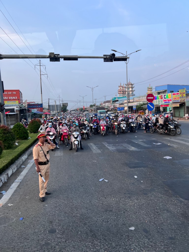 DUE TO CONGESTION THE GOVERNMENT WANTS PEOPLE TO USE MOTORCYCLES OR SCOOTERS. EVERY ROADWAY AND INTERSECTION IS CROWDED WITH 2 WHEEL VEHICLES. WHEN THE LIGHT TURNS GREEN THEY START WITH SOME DEGREE OF ORDER AND CHAOS WHICH IS DIFFICULT FOR AMERICANS TO UNDERSTAND AND FOLLOW. NOTE THE TRAFFIC COP IN THE PHOTO. IF INTERESTED I FILMED A NUMBER OF VIDEOS OF THE TRAFFIC FLOW.