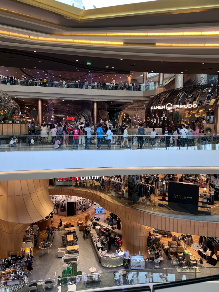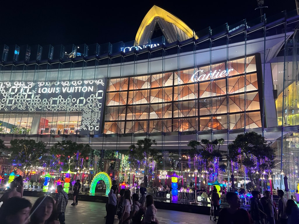 ADMIRING THE SCENERY WE DECIDED TO TAKE A BOAT TAXI, COST 8 BAHT TO CROSS THE RIVER TO A NEW SHOPPING COMPLEX. ICOMSIAM IS AN ASSULT ON ONE’S SENSES! THERE ARE 8 FLOORS WITH EVERY IMAGINAL RESTAURANT AND FOODS BEING SERVED. THERE WAS A COLLEGE COMMENCEMENT EVENT BEING HELD IN THE COMPLEX. A 3 STORY CIRCULAR WATERFALL IS HIGHLIGHTED WITH LASERS. THERE WERE 2 AUTO DISPLAYS – PORSCHE AND GEM. THERE WAS THE LARGEST APPLE STORE WE HAVE EVER BEEN IN. THREE FLOORS HAVE LOCAL ARTISIAN CRAFTS FOR SALE.