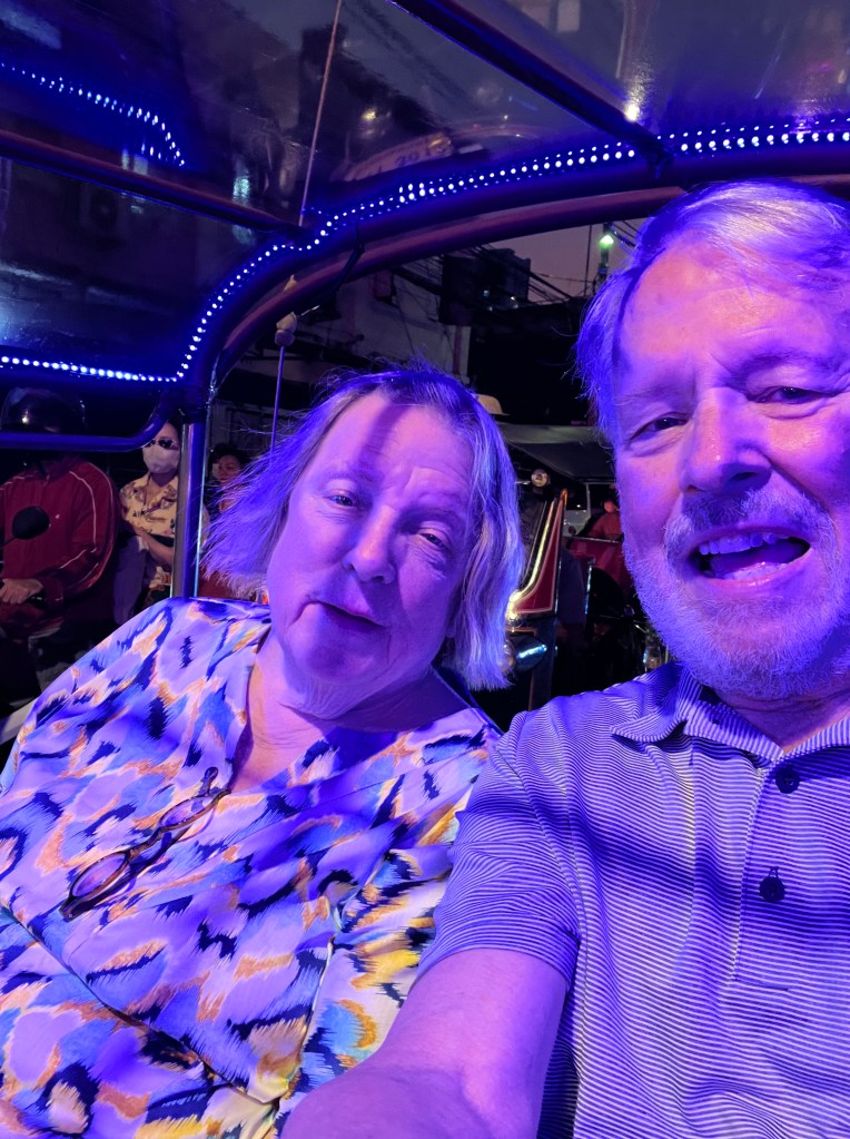 AFTER DARK WE CHOSE A FOODIE TRIP TO EXPLORE AND SAMPLE BANGKOKS STREET FOOD. BOARDING A TUT-TUT WE TOOK OFF TO ‘EAT LIKE A LOCAL’. SITTING IN BACK OF A DECORATED 3 WHEEL MOTORCYCLE CART WE WERE IN THE MIDDLE OF THE EVENINGS’ CHAOTIC RUSH HOUR TRAFFIC WITH TRUCKS, CARS, MOTOR CYCLES, SCOOTERS AND OTHER TUT-TUTS. SEAT BELTS? WE STOPPED AND SAMPLED A VARIETY OF RESTAURANTS WHILE STANDING OR OCCASIONALLY SITTING ON THE SIDEWALK. THE FOOD WAS AMAZING!